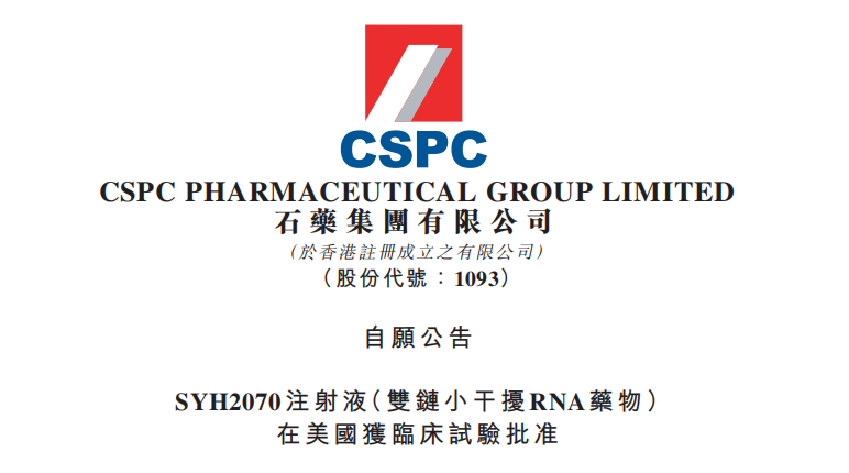 10月9日,石藥集團(1093.HK)宣布,本集團自主研發(fā)的化學(xué)1類新藥SYH2070注射液(雙鏈小干擾RNA(siRNA)藥物)(下稱:該產(chǎn)品)已獲得美國食品藥品監(jiān)督管理局(FDA)批準,可在美國開展臨床試驗。該產(chǎn)品亦于2025年9月獲得中華人民共和國國家藥品監(jiān)督管理局批準在中國開展臨床試驗。