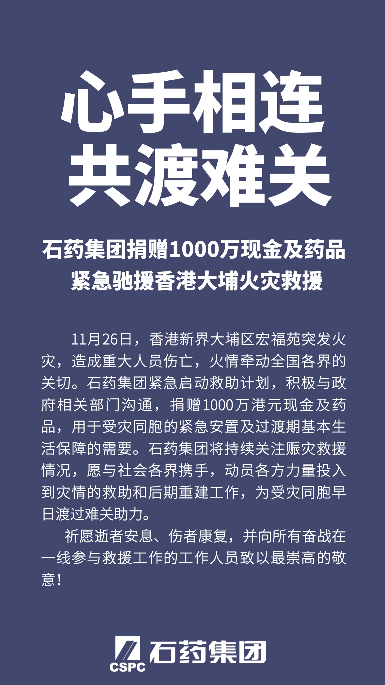 石藥集團捐贈1000萬現金及藥品 緊急馳援香港大埔火災救援