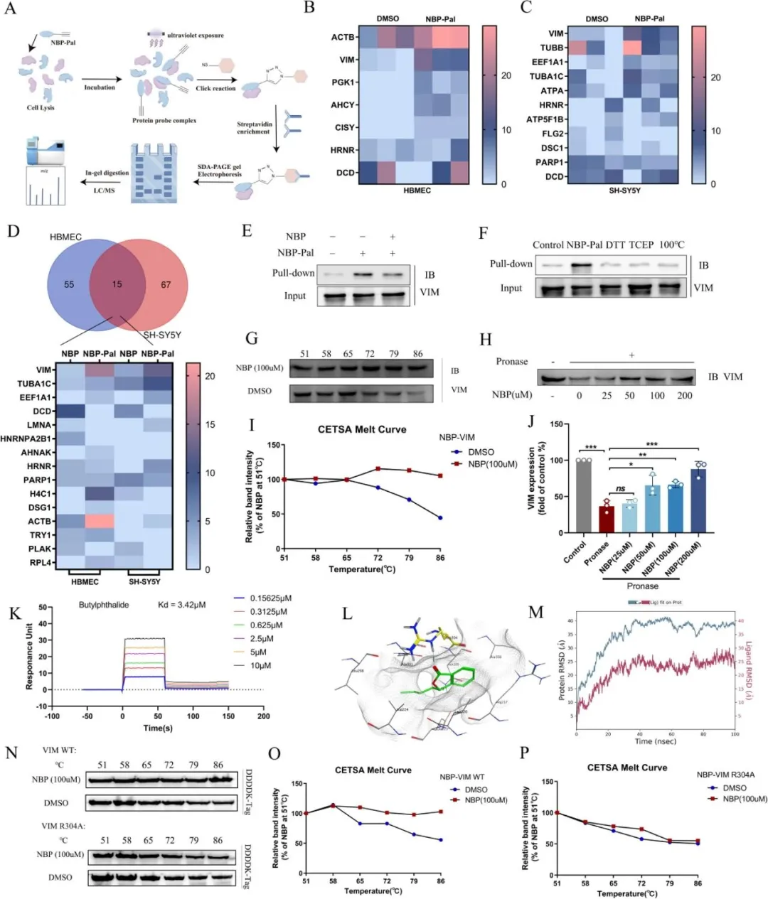 結果二:為了明確其作用機制,研究通過合成NBP光親和探針,在內皮細胞和神經元中成功“垂釣”出了靶蛋白VIM。隨后多個生化實驗表明NBP與VIM存在特異性且穩定的結合。