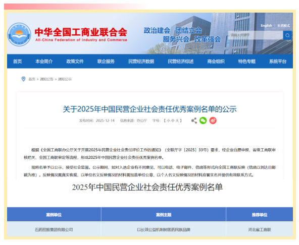 石藥集團(tuán)榮膺“2025年中國民營企業(yè)社會(huì)責(zé)任優(yōu)秀案例”稱號(hào)