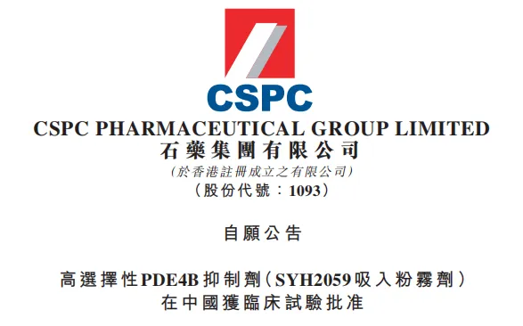 石藥集團高選擇性PDE4B抑制劑(SYH2059吸入粉霧劑)在中國獲批臨床