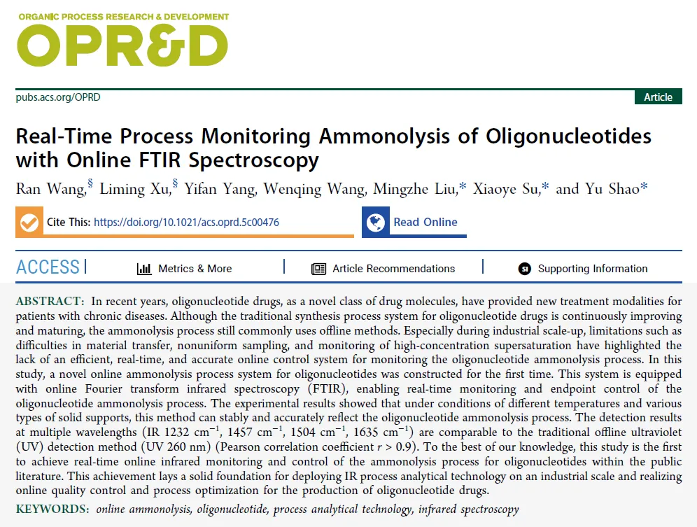 近日,由石藥集團研發的基于紅外光譜技術用于寡核苷酸在線氨解監測的研究成果以研究論文(Article)形式發表在國際著名化學期刊ACS旗下Org. Process Res. Dev.雜志,標題為《Real-Time Process Monitoring Ammonolysis of Oligonucleotides with Online FTIR Spectroscopy》。