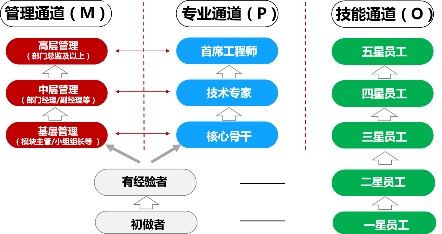 ① 管理通道(M)側重管理能力提升,專業通道(P)側重技術領域縱深發展,兩者跨職能、跨領域發展。